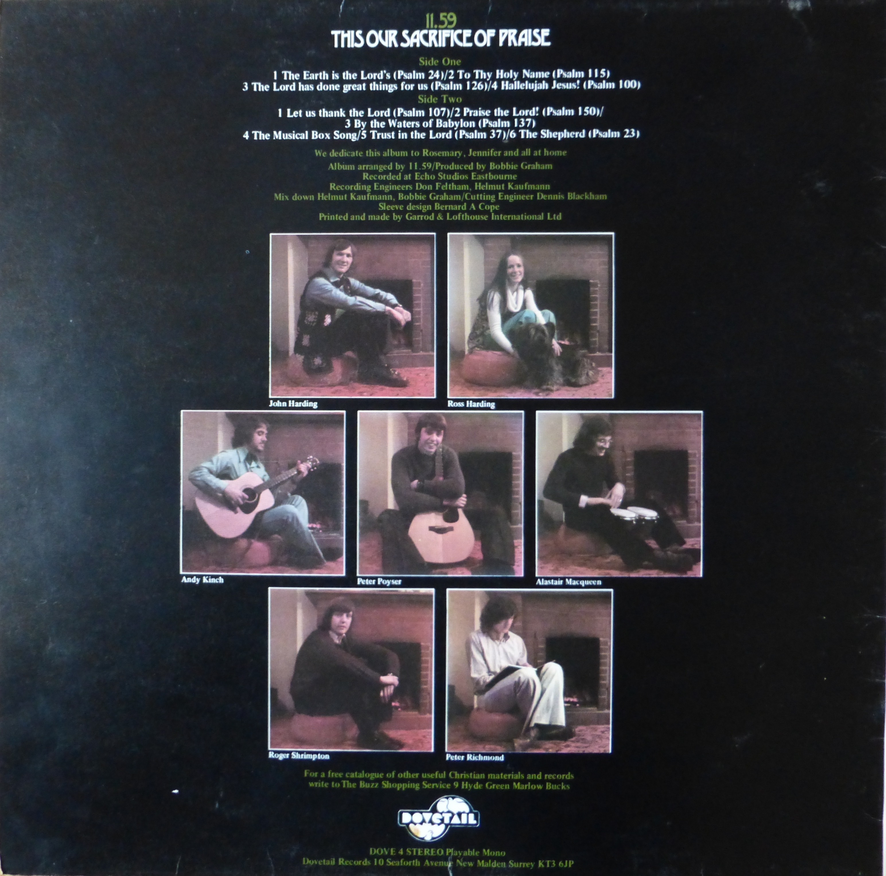 This was a Christian album released in 1974. 11.59 is the name of the group (same name as a song by Blondie I believe) and obviously refers to the time being one minute to midnight - that is to say we are close to the Lords return (don't think Blondie had the say interpretation). This our sacrifice of praise has been one of my favorite albums for a long time now.