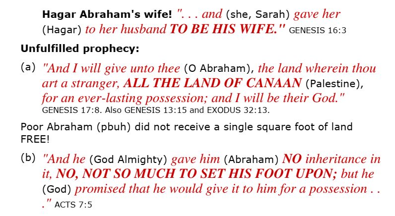 (a), (b) With Deedat’s comments about Abraham not receiving the promise land we see Deedat again not being prepared to analyse God’s word. He quotes verse 5 of Acts (Acts 7:5) but not surprisingly does not quote verse 17 (Acts 7:17) “As the time drew near for God to fulfil his promise to Abraham, the number of our people in Egypt had greatly increased.” By pointing out that by fulfilling the promise to Abraham’s descendants, God is teaching us that not only his descendants but we who are adopted into his family – that is the gentiles - are one with him in the blessing. Abraham rejoiced to see the fulfilment of the promise and shares in it with us all. Abraham is not dead but is living and will be resurrected and enter his promised land. As Jesus said in Matthew 22 (Matt 22:32) “I am the God of Abraham, the God of Isaac, and the God of Jacob’? He is not the God of the dead but of the living.”